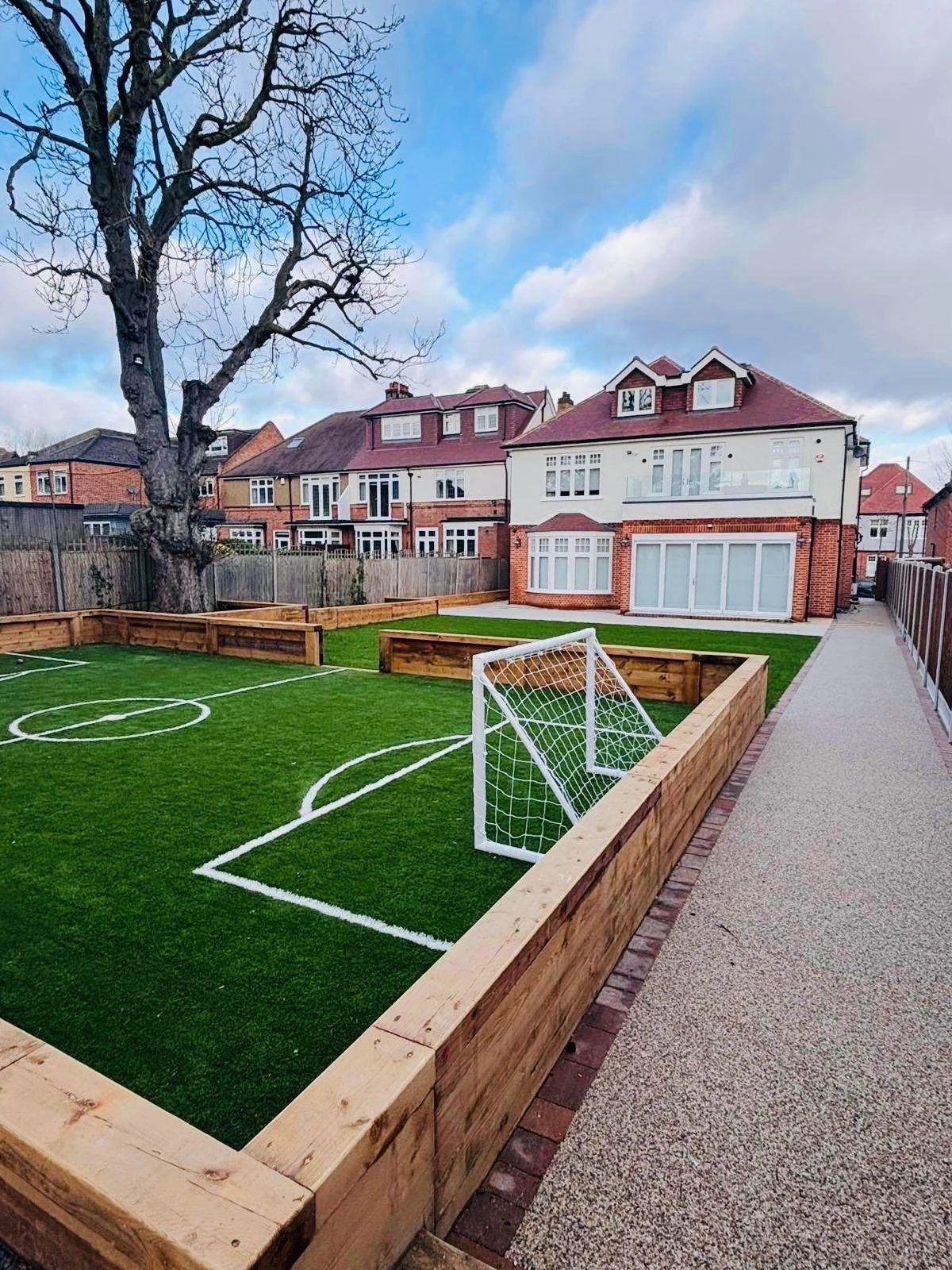 Services: Champion Consulting delivered the extension and full remodelling of an existing detached home, transforming it into a luxury five-bedroom property. The scheme involved significant structural works to more than double the size of the building and features high-end fixtures and finishes throughout. The home also benefits from advanced IT and AV systems, along with extensive landscaping — including a mini football pitch and a golf simulator.